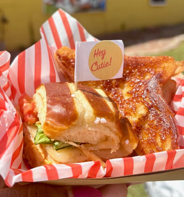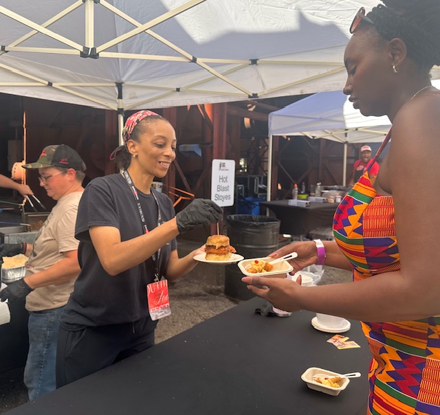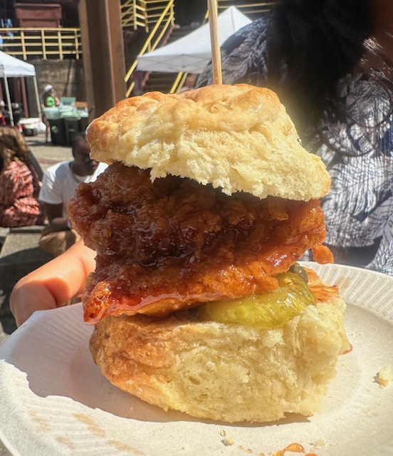 But luckily for Birmingham residents, the wait at Sloss Furnaces today wasn’t anywhere near that long. Granted, there was a continuous line at Erika’s tent during the Southbound Food Festival’s Funk Brunch, where she offered buttered, golden biscuits filled with a hot honey glazed fried thigh and bread and butter pickles. Yet, the line moved quickly and easily as a team fried the chicken on site, dipped it into the glaze, plated it and handed it off to attendees, one by one.