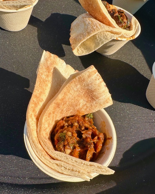 While on stage at the Pepper Place Market, she talked about her cooking and how she ended up in Alabama. (Her mother left Egypt in the early 1980s to escape religious persecution. Her mother landed in Demopolis, AL. And while shopping at the local market, the produce manager was struck by the beauty of Sarah’s mother and helped Sarah’s mother pick out a bag of potatoes. He later invited himself to dinner. Things clicked, they dated, married and started a family. Sarah grew up in Demopolis, but as an adult, she left Alabama for a few years. She returned in 2020 and started Abadir, making wholesome, seasonal baked goods and light fare for pop-up events. Her mother still lives in Demopolis.)