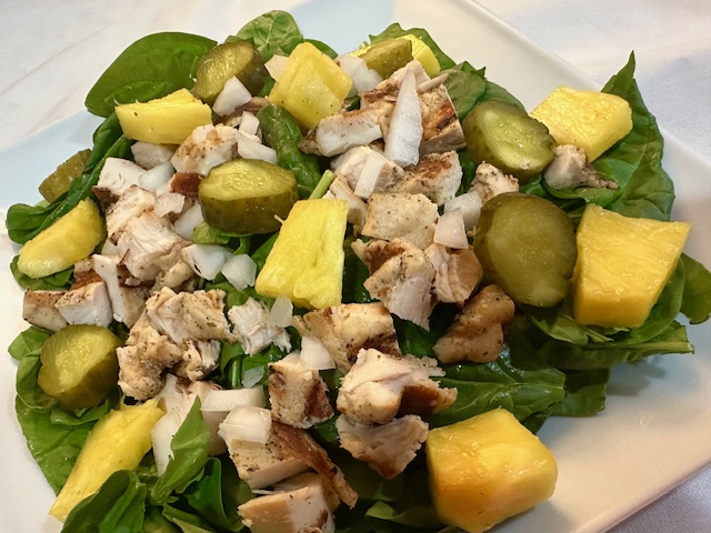 Determined to make her new bowls of greenery interesting, she got creative. She added pickles and pineapples, yes, at the same time, to enrich the taste and color of her servings of spinach, extra onions and grilled chicken. The topped it off with a side of Ranch dressing.