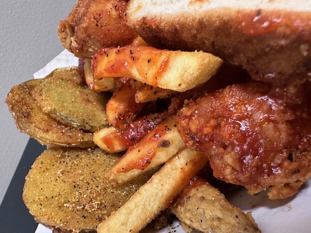 The Manager’s Special from Green Acres in downtown Birmingham features fries and wings flavored with salt and pepper. When one orders it “all the way,” it comes drizzled with a mix of hot sauce and ketchup. On the side is a serving of fried green tomatoes and a slice of white bread. (Photo by Chanda Temple)