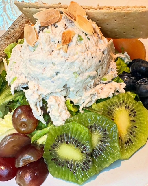 The café menu features Kathy G’s classic French recipe chicken salad, which can come on whole wheatberry bread for a sandwich or with a salad. As a salad plate, it is topped with toasted almond slivers, has a touch of Dijonnaise, has tarragon and is accented with a whole wheat sourdough crostini and two, long flatbread crackers from Continental Bakery. The chicken salad plate comes with seasonal fruit, such as kiwi, grapes, blueberries and a slice of cantaloupe.