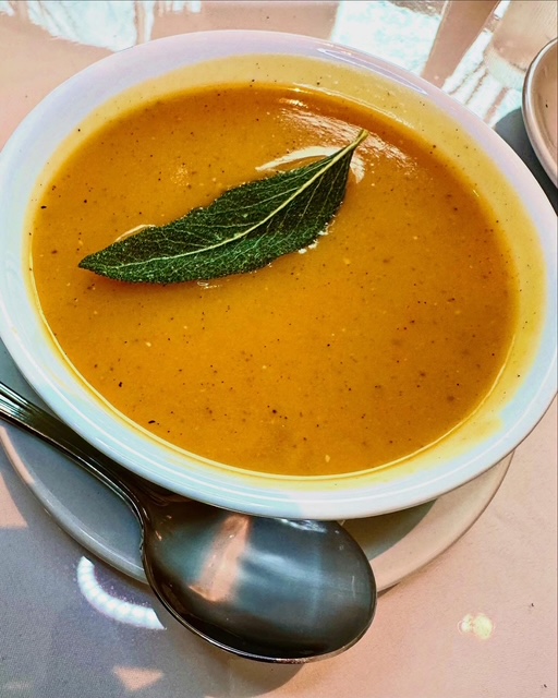 • Butternut Squash Soup, which has a little nutmeg and a trace of cinnamon blended in with roasted butternut squash. Each creamy and hearty serving is accented with fried sage on top to add additional flavor and texture.
